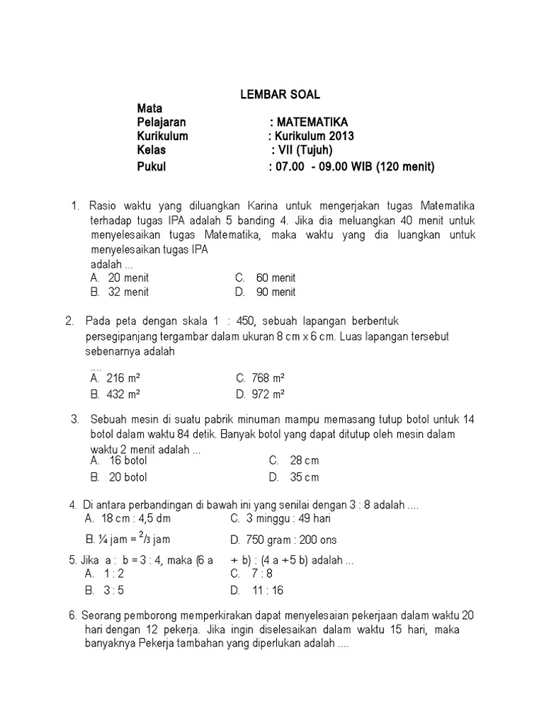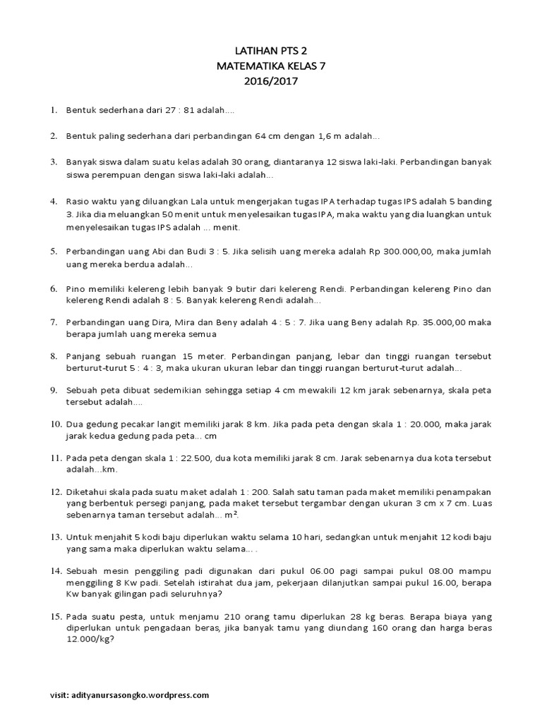 Latihan Pts 2 Matematika1 from imgv2-2-f.scribdassets.com Jika rudi meluangkan 90 menit untuk menyelesaikan tugas matemauka, maka waktu yang diluangkan udin untuk menyelesaikan tugas matematika adalah. Dan berikut ini ada tiga soal cerita yang berkaitan dengan perbandingan waktu. Rasio waktu yang diluangkan karina untuk mengerjakan tugas matematika terhadap tugas ipa adalah 5 banding 4. Jika dia meluangkan 40 menit untuk menyelesaikan tugas matematika, maka waktu yang dia luangkan untuk menyelesaikan tugas ipa adalah. Raslo waktu yang diluangkan rudi dan udin untuk mengerjakan tugas matematika adalah 6 banding 5. Perbandingan waktu karina untuk mengerjakan tugas matematika terhadap tugas ipa adalah 5 banding 4. Rasio waktu yang diluangkan karina untuk mengerjakan tugas b bahasa indonesia terhadap tugas tik adalah 3 2 jika dia meluangkan 1 jam untuk menyelesaikan tugas tik, maka waktu yang dia luangkan untuk menyelesaikan tugas bahasa * indonesia adalah. Perbandingan waktu yang diluangkan wayan untuk mengerjakan tugas matematika dan ipa adalah 6 berbanding 5.