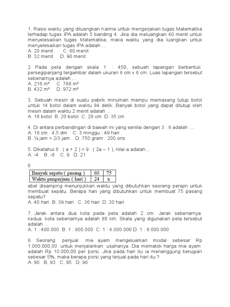 Urur a, b, c atau di lombar jawaban yang tersedial 1. Rasio waktu yang diluangkan karina untuk mengerjakan tugas matematika terhadap tugas ipa adalah 5 banding 4. Rasio waktu yang diluangkan karina untuk mengerjakan tugas matematika terhadap tugas ipa adalah 5 banding 4. Hal serupa juga akan terlihat, misalnya pada baris ketiga dan keempat. Untuk menyelesaikan suatu pekerjaan yang sama, ali dapat menyelesaikan dalam 60 hari, budi dapat menyelesaikan dalam 75 hari sedangkan chandra dapat.